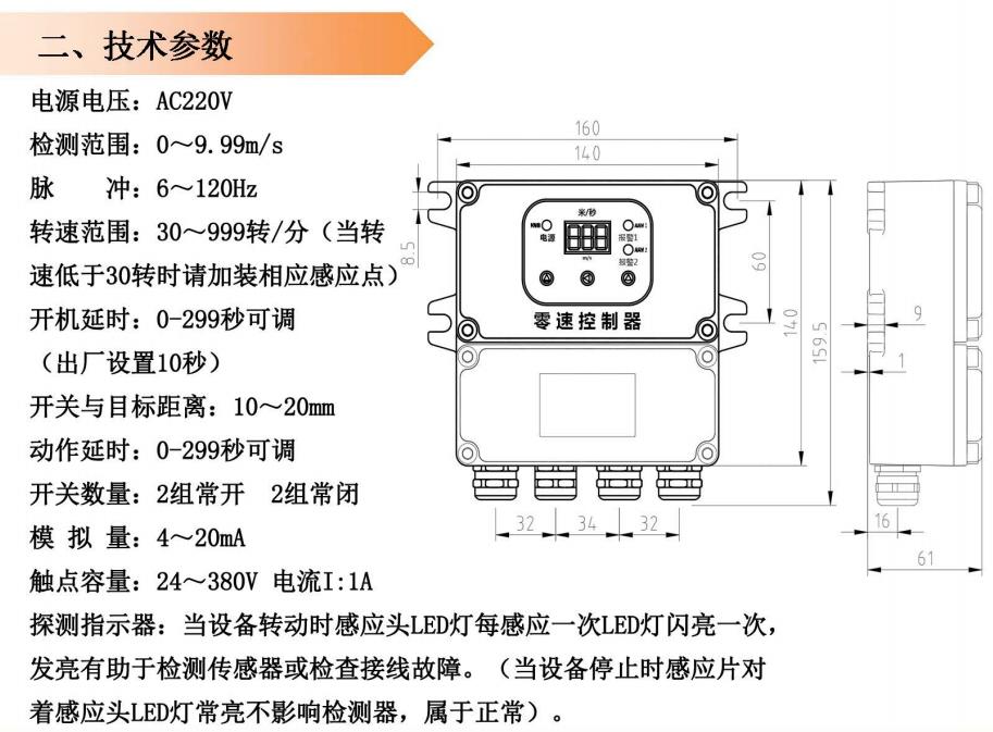 概述 該檢測器是一種經(jīng)濟(jì)、可靠性強、對軸轉(zhuǎn)速及其他旋轉(zhuǎn)裝置簡單通用的檢測裝置,當(dāng)檢測到目前信號低于或高于正常轉(zhuǎn)速范圍,開關(guān)輸出兩組開關(guān)信號,以供報警或停機(jī)。無運動部件、無磨損、安全壽命長,一體化結(jié)構(gòu),集中的控制裝置,設(shè)定或故障檢修簡單。外殼采用防水、防塵的殼體,可直接安裝在惡劣環(huán)境中使用。